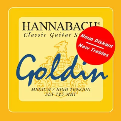 Classical guitar string set Hannabach Goldin E725MHT - Дисканты из суперкарбона золотисто-желтого цвета со звуком более мягким и теплым, чем у обычных карбоновых струн. Басы Goldin с намоткой из золотистой никелевой нити. Среднее натяжение дискантов и сил