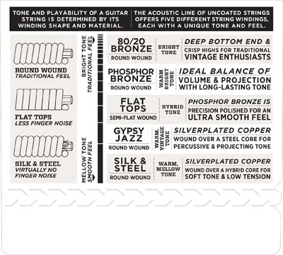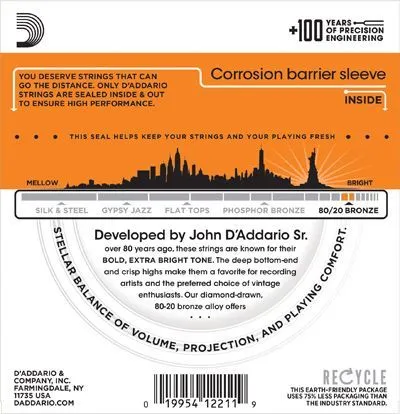 - Бронза 80/20, часто называемая латунью, является оригинальным акустическим сплавом, выбранным Джоном Д'Аддарио Старшим и Джоном Д'Анджелико в 1930х годах. Чистый, глубокий тон с хорошей проекцией. Популярны для звукозаписи и среди множества традиционалистов и энтузиастов-аутентистов