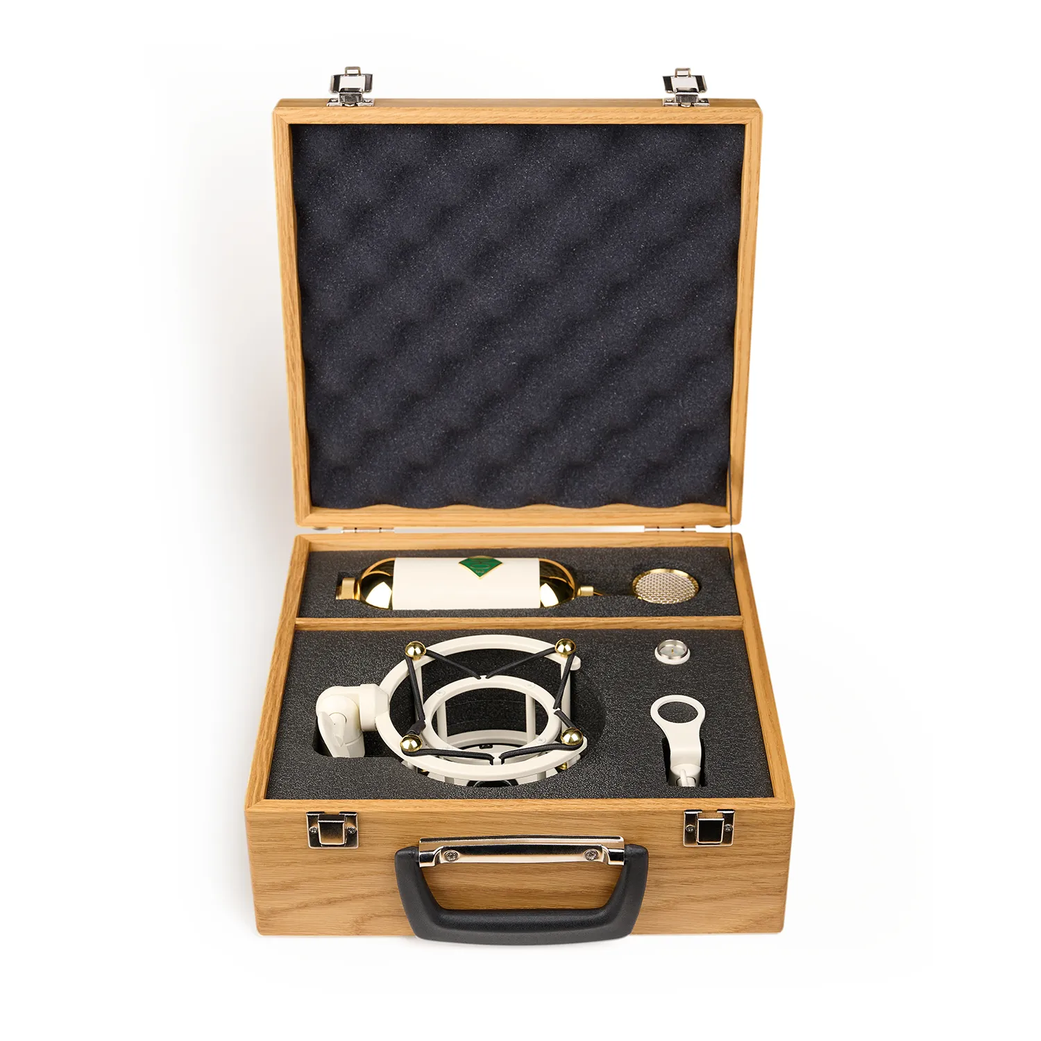 Микрофон поставляется в комплекте с амортизатором, и деревянной шкатулкой из дуба для хранения микрофона. Опционально может поставляться с капсюлем направленности круг.