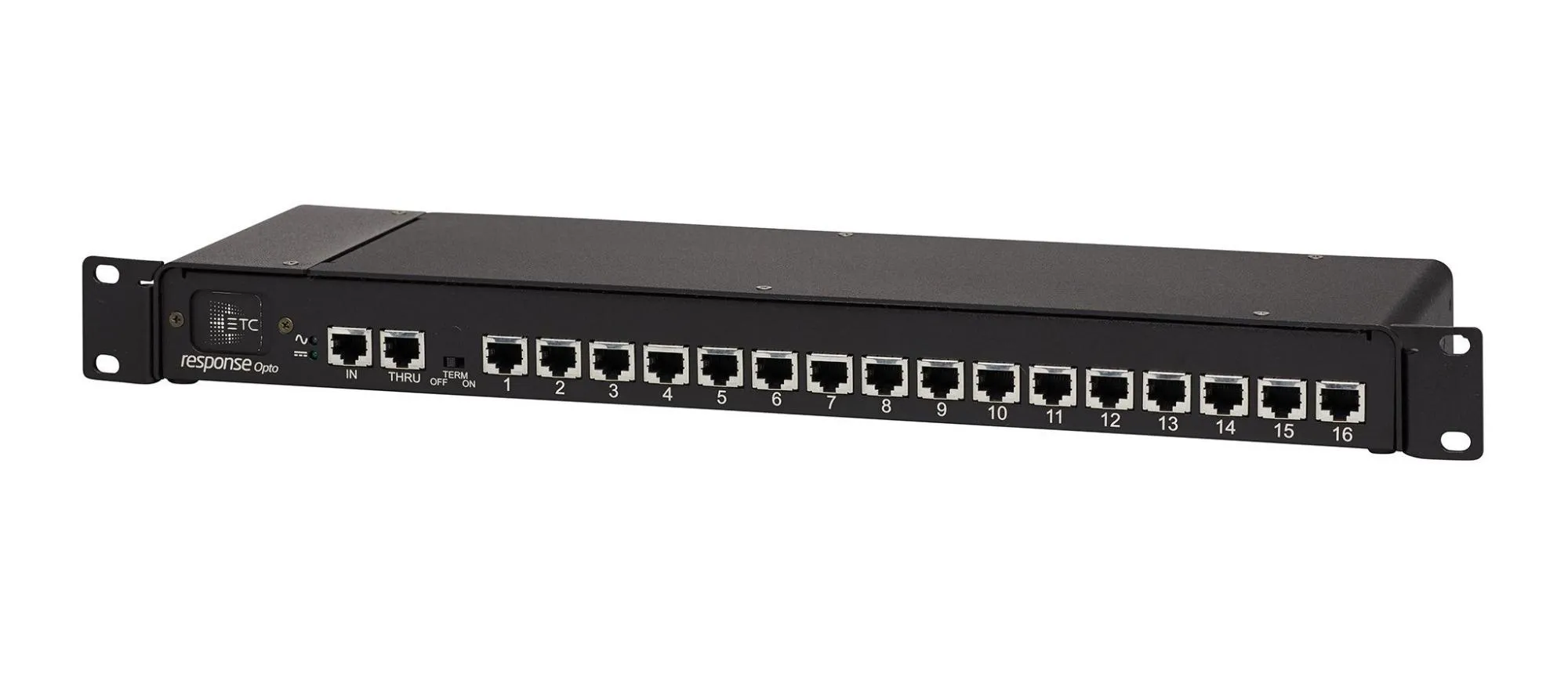 ETC RSN-OPTO-16R Response Opto-Splitter - 16 Port RJ45 Rack-mount Сплиттер (разветвитель) DMX-сигнала, 1 вход (IN), 1 сквозной (THRU), 16 выходов (OUT), поддерживаемые протоколы DMX-512/RDM, подключение сигнала - разъемы RJ45. Исполнение - блок для монтаж