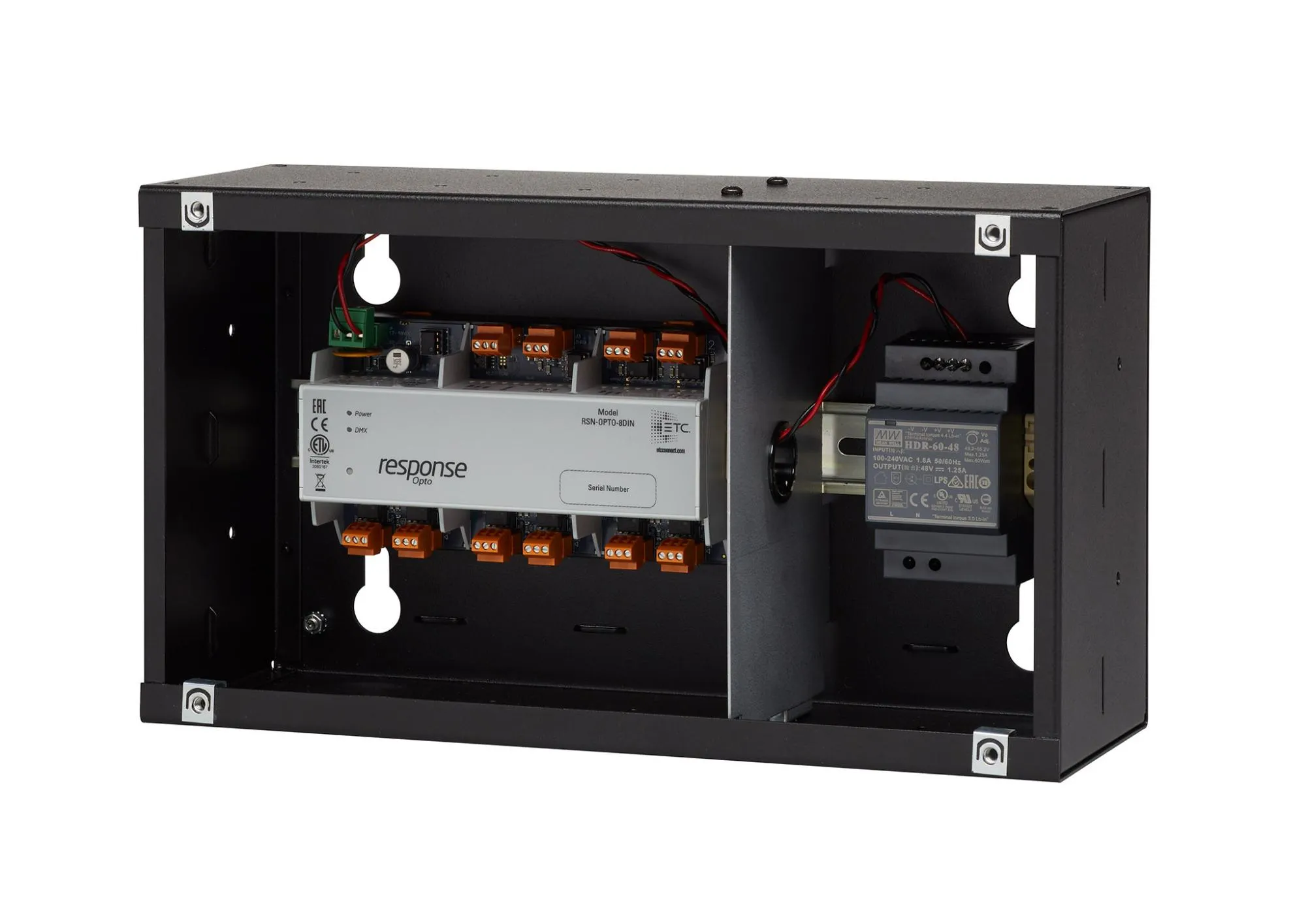 ETC RSN-OPTO-BOX Response Opto-Splitter - DIN Box with single splitter Сплиттер (разветвитель) сигнала DMX-512, модель ETC RSN-OPTO-8DIN, установлен в монтажную коробку с DIN-рейкой в комплекте с блоком питания 48В (арт. PS506). В комплекте: IDC-коннектор