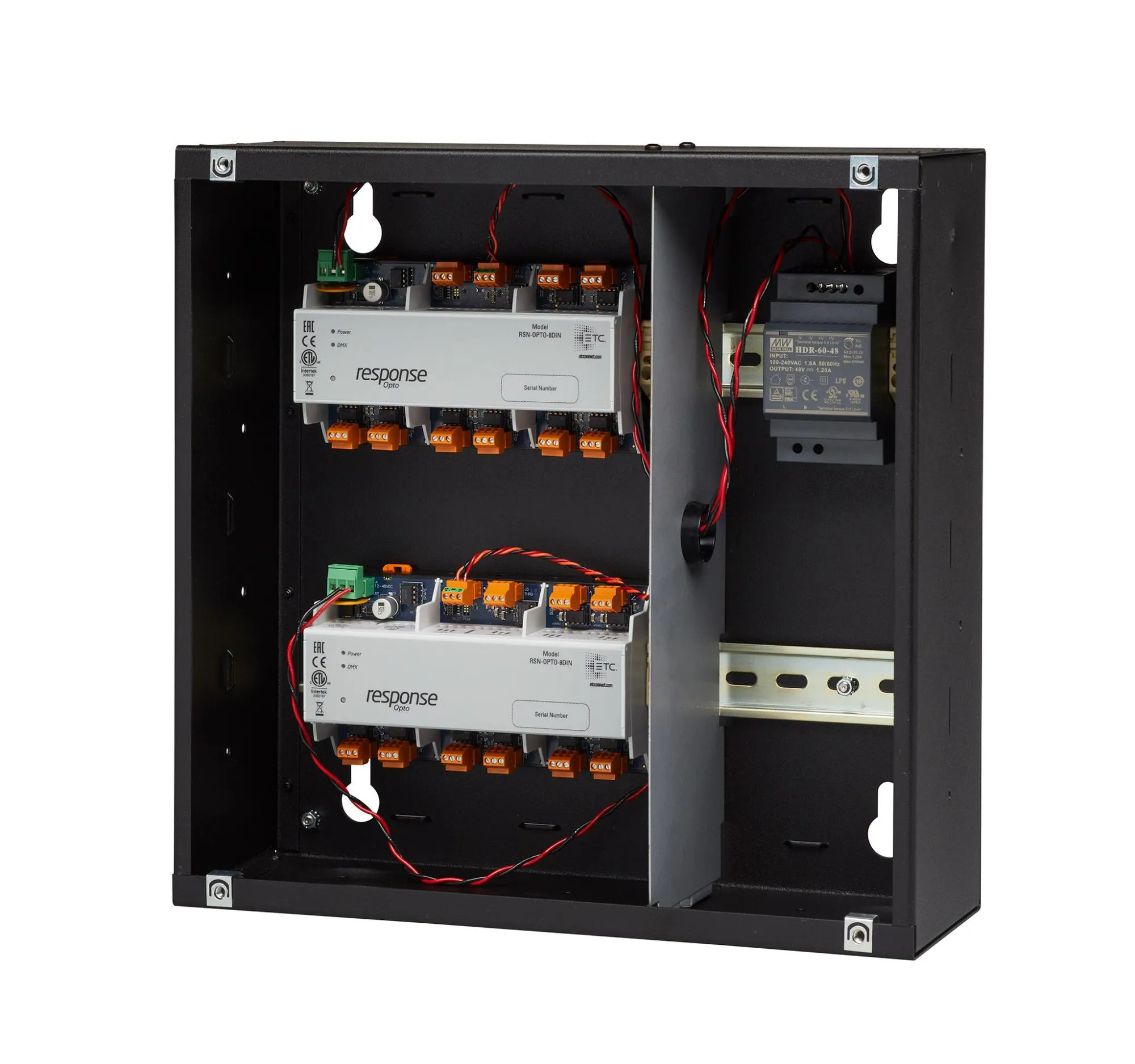ETC RSN-OPTO-DBOX Response Opto-Splitter - DIN Box with dual splitter Сплиттеры (разветвители) сигнала DMX-512, модель ETC RSN-OPTO-8DIN - 2 шт., установлены в монтажную коробку с DIN-рейкой в комплекте с блоком питания 48В (арт. PS506). В комплекте: IDC-