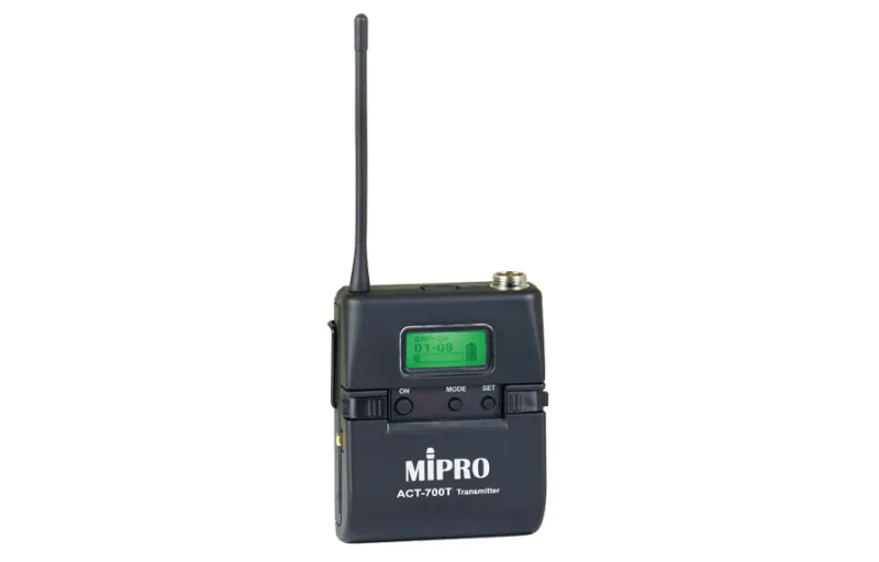 Mipro ACT-700T Поясной широкополосный UHF передатчик серии ACT-700. Ширина полосы 72 МГц, диапазон рабочих частот 482-554 MHz. Питание от двух батареек класса АА.