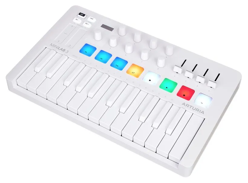 Arturia MiniLAB 3 Alpine White - 25 клавишная MIDI-клавиатура - пэд-контроллер, 9 регуляторов, 8 RGB пэдов, 8 фейдеров, дисплей, сенсорные регуляторы Pitch/Modulation, MIDI-выход, 1/4" Jack вход педали, режим Chord, арпеджиатор, USB-C, ПО