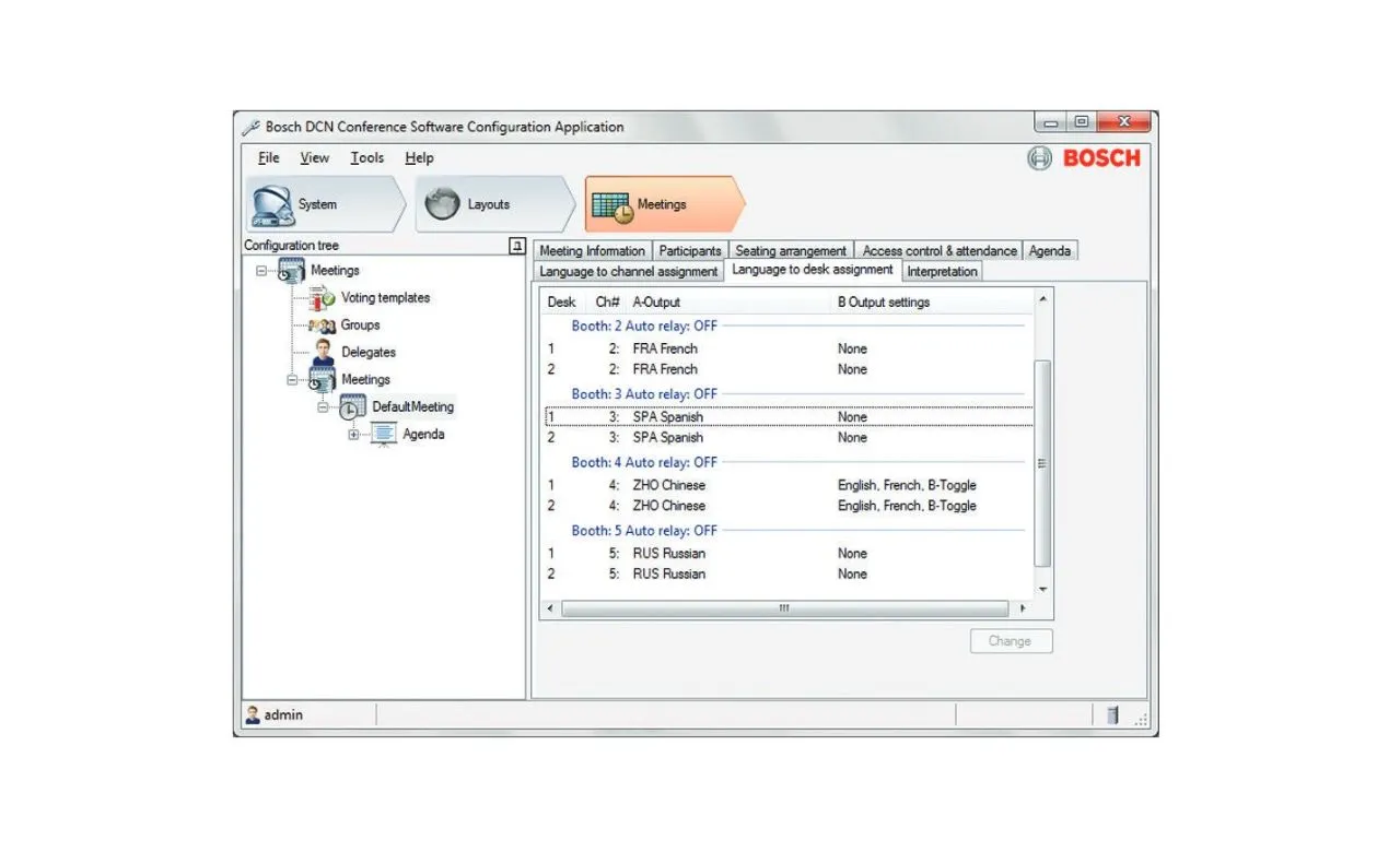 В программе настройки оператор определяет максимальное число каналов системы, которые будут использоваться для перевода. Оператор может подготовить настройки перевода для каждого заседания (количество переводчиков, имена каналов для различных языков, режим блокировки микрофона переводчика, включение / выключение запроса говорите медленнее и распределение в зале).