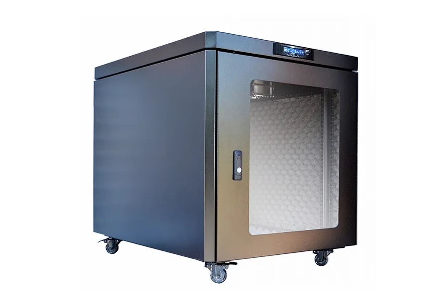Для организации отвода вырабатываемого оборудованием тепла предусмотрено три встроенных вентиляционных модуля на верхней панели шкафа. Информация о состоянии воздуха отображается на LCD-дисплее с термодатчиком, установленном на передней панели.