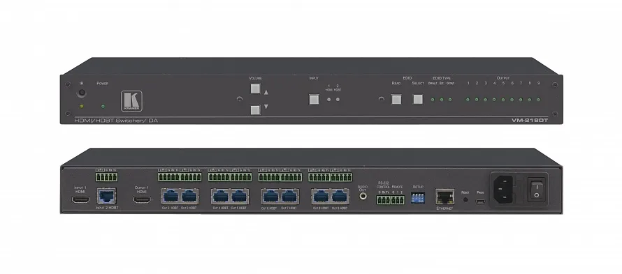 Усилитель-распределитель и коммутатор Kramer Electronics [VM-218DT] 2х1:8 HDMI и HDBaseT, передача RS232, ИК и стерео аудио; поддержка 4К60 4:2:0