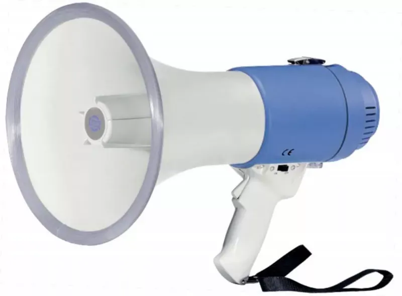 ER 55S ручной мегафон с сиреной, 25 ватт, питание 12 вольт (8 батарей тип "С"), размеры Ф230х370 мм, вес 1,65 кг, Work