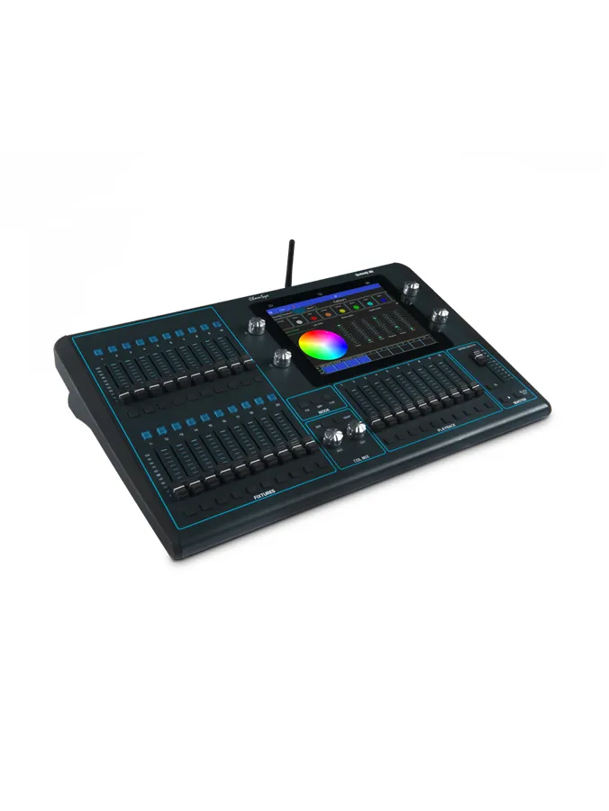 QuickQ 20 Пульт управления светом QuickQ 20 Световая консоль QuickQ 20. Сенсорный дисплей 9,7 дюймов. Поддерживает 2 потока (Universe) 1024 каналов. Управление: 20 фейдеров для управления приборами, 10 назначаемых мастер фейдеров, 1 Master