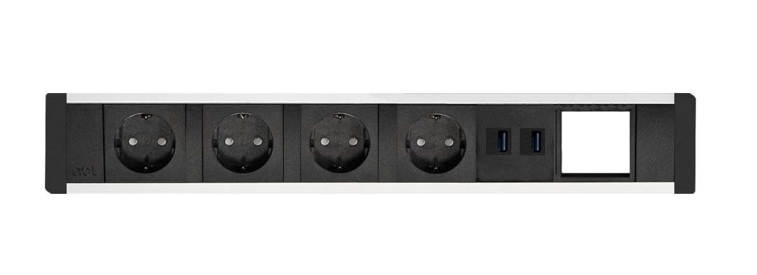 Встраиваемая розеточная станция серии Level тип E (Level-E) с 4 розетками, 2xUSB-A и 1 слотом для IMP, черная с серебристымХарактеристики