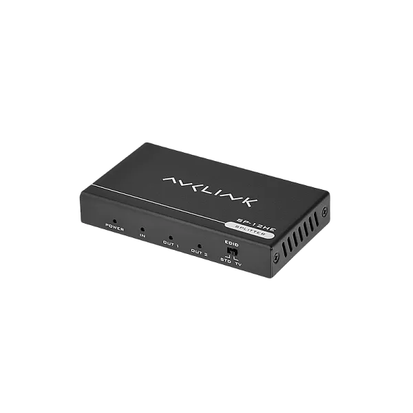 AVCLINK SP-12HE Усилитель-распределитель HDMI сигнала. Входы: 1 x HDMI. Выходы: 2 x HDMI. Максимальное поддерживаемое разрешение: 4K@60Гц (4:4:4). Максимальная скорость передачи данных: 18 Гбит/с. Управление EDID: режим STD (1080p) и режим TV (копирование