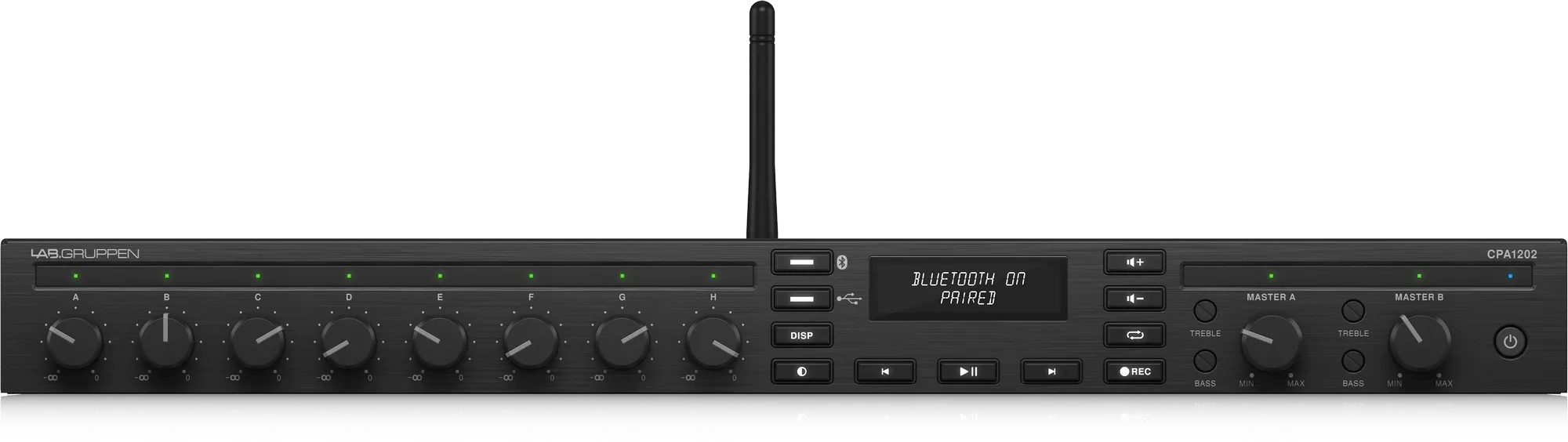 Lab.gruppen cpa1202 микшер-усилитель с bluetooth и usb-плеером, 8 входов на 2 зоны или 4 стерео x 1 стерео, 8 mic/line, из них 2 входа приоритета с дакингом, 2 выхода aux, 4/8ом,70/100 b - 2 канала по 120 вт, крепление в рэк, подключение 2 регуляторов