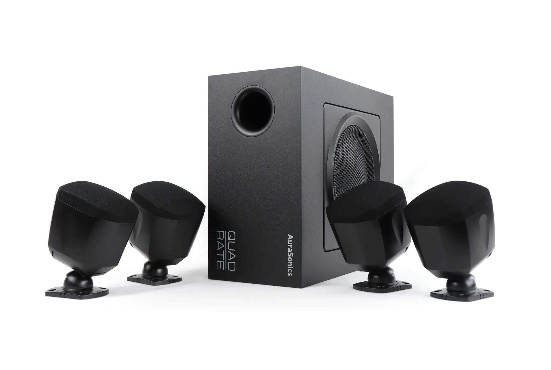 Aurasonics quadrate-bk комплект настенный сабвуфер 6,5" и 4 сателлита 3", встроенный кроссовер, 70/100b-80/40/20/10 вт, 80вт/8ом, 60гц-18кгц, чёрный