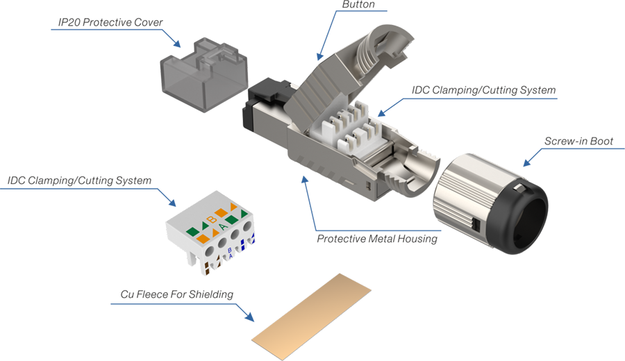- Соответствие стандарту CAT6a: поддержка скоростей передачи данных до 10 Гбит/с на расстоянии до 55 м.