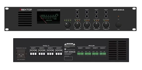 ВЕКТОР УМТ-4060Д Усилитель мощности класс D 4 канала по 60 Вт/100 В, 70 В. Линейные вход /выходы, (разъем тип Phoenix). Индикация режимов работы усилителя. Регулировка уровня выходного сигнала, регулировка НЧ/ВЧ, многоступенчатая защита. Питание 220-230 В