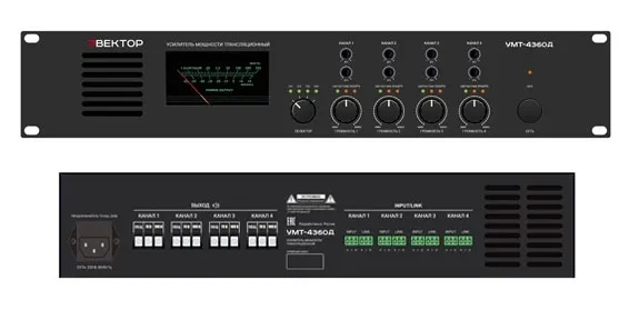 ВЕКТОР УМТ-4360Д Усилитель мощности класс D 4 канала по 360 Вт/100 В, 70 В. Линейные вход /выходы, (разъем тип Phoenix). Индикация режимов работы усилителя. Регулировка уровня выходного сигнала, регулировка НЧ/ВЧ, многоступенчатая защита. Питание 220-230