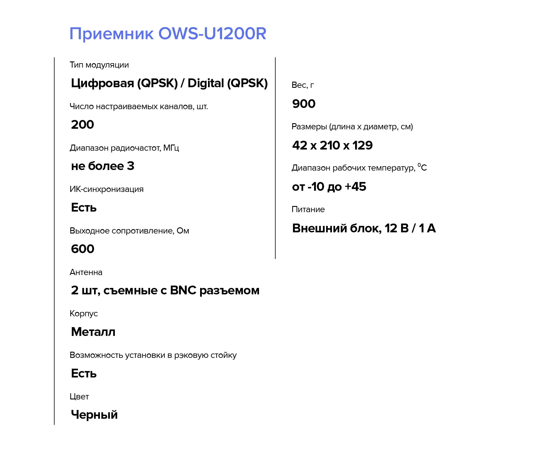 Система разработана для использования на сцене, вокальных выступлений и конференций. Благодаря продуманной конструкции и современным технологиям, OWS‑U1200D01 гарантирует стабильную передачу сигнала и удобство эксплуатации.