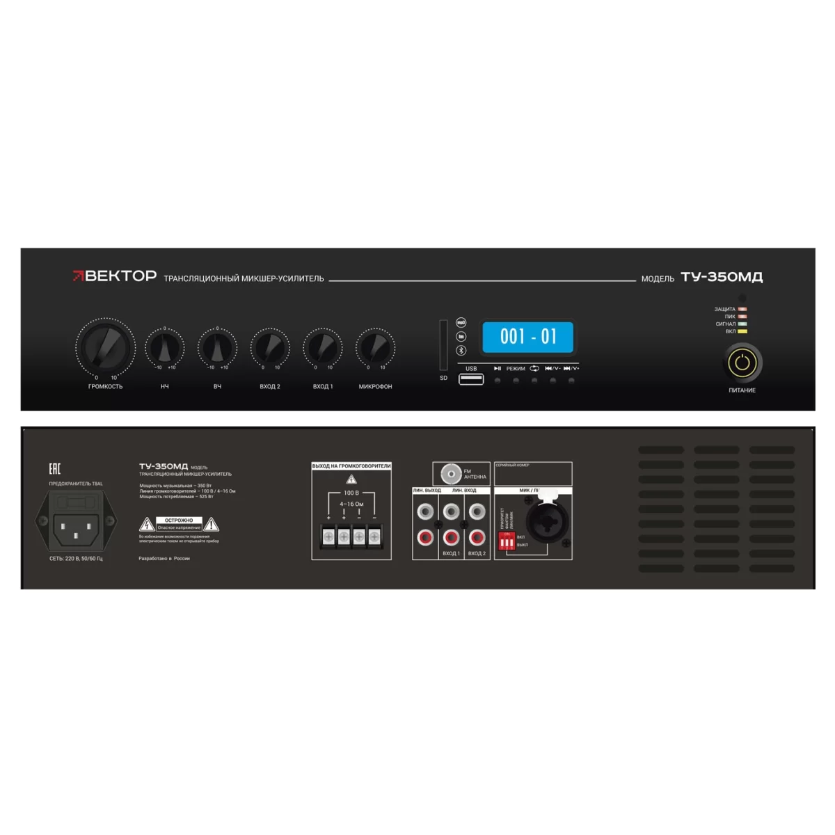 ВЕКТОР ТУ-350МД Комбинированный микшер-усилитель класс D. Мощность 350Вт. Выход 100В\4-16Ом, 1 микр и 2 AUX входа, 1 AUX выход. Цифровой FM тюнер, MP3 плеер, USB, SD, Bluetooth. Питание 220В. Рэковое крепление в комплекте.
