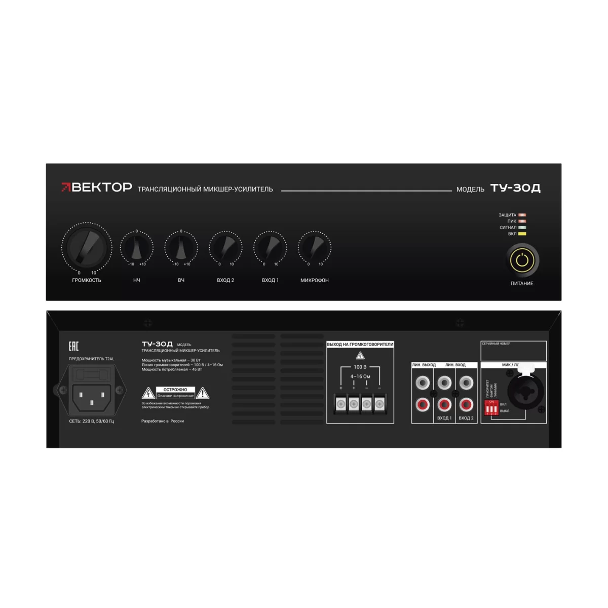 ВЕКТОР ТУ-30Д Микшер-усилитель класс D. Мощность 30Вт. Выход 100В\4-16Ом, 1 микр и 2 AUX входа, 1 AUX выход. Питание 220В. Рэковое крепление в комплекте.