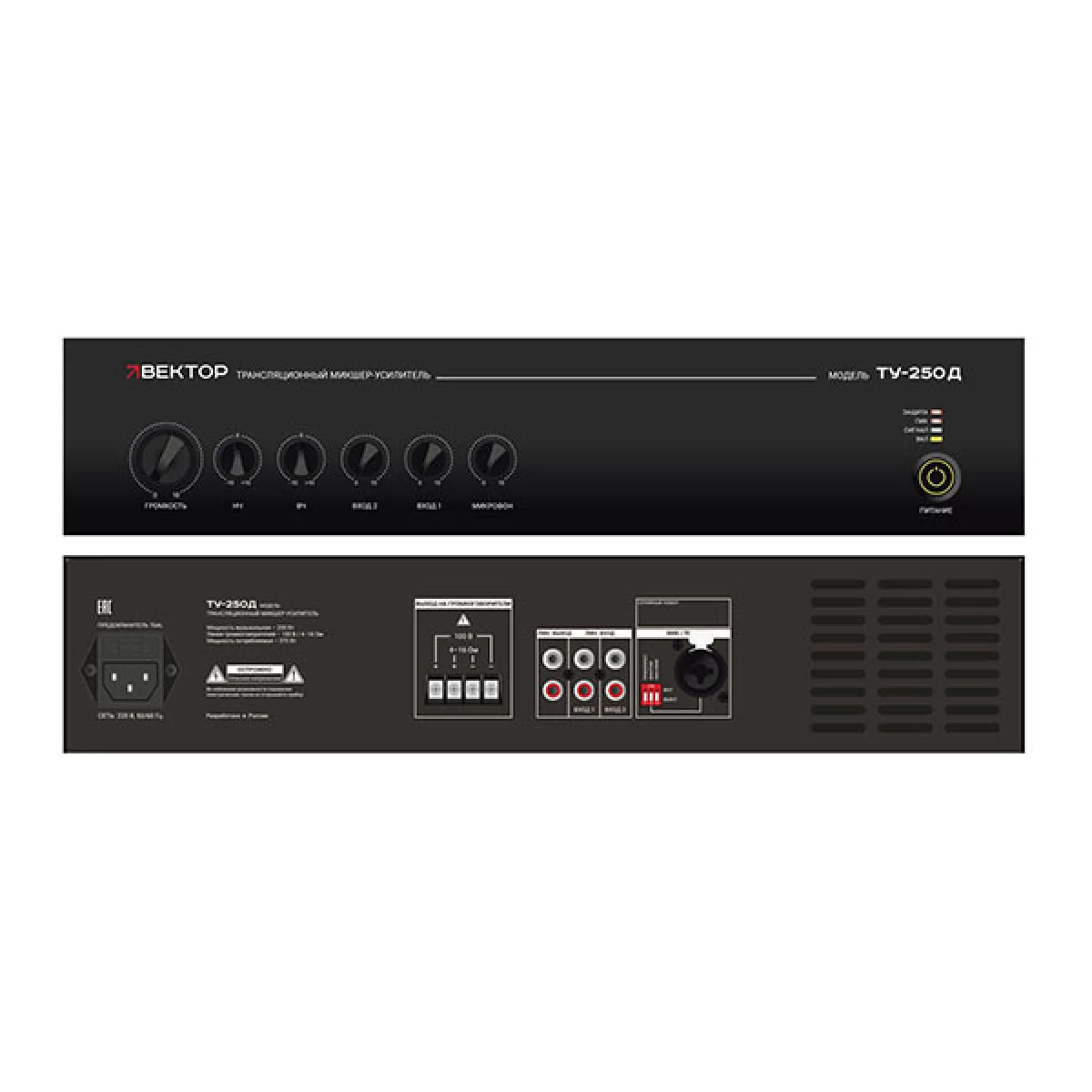 ВЕКТОР ТУ-250Д Микшер-усилитель класс D. Мощность 250Вт. Выход 100В\4-16Ом, 1 микр и 2 AUX входа, 1 AUX выход. Питание 220В. Рэковое крепление в комплекте.