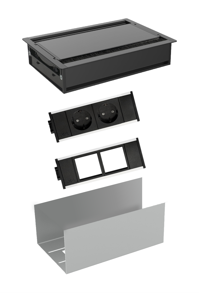 Комплект розеточной станции серии Conference MIN с лючком, 2 розетки и 2 слота для IMP, черныйХарактеристики