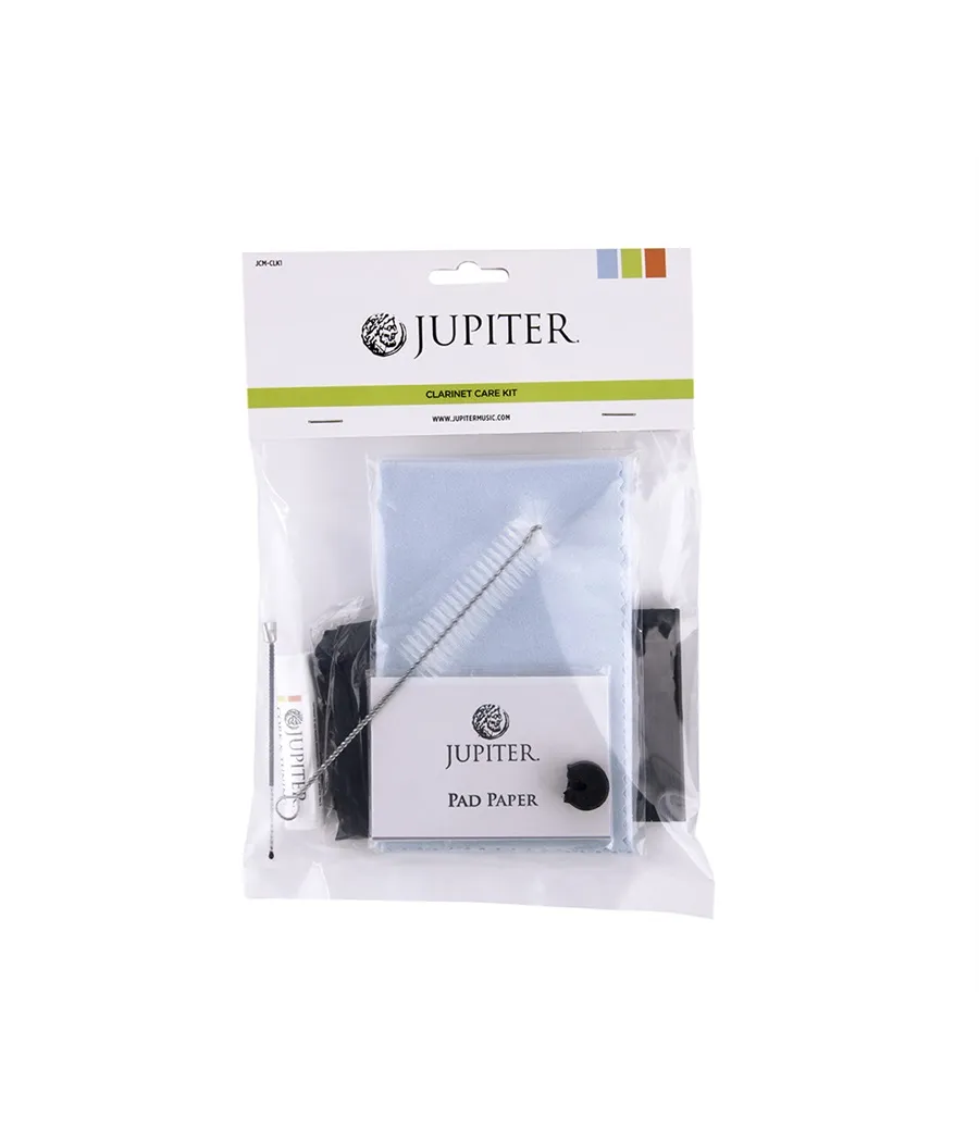 Jupiter JCM-CLK1 Набор для ухода за кларнетом включает в себя: полировальную салфетку, шелковую салфетку для корпуса, ершик для корпуса, ершик для мундштука, смазку для пробки, футляр /держатель для трости, резиновую накладку на упор большого пальца, бума