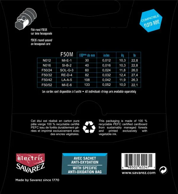 Комплект струн для электрогитары savarez focus f50m - струны для электрогитары с обмоткой из нержавеющей стали по шестигранной основе. среднее натяжение, толщина .012-.052 дюйма