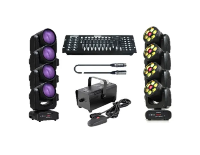 Включает в себя набор компактных светодиодных вращающихся голов с встроенными динамическими эффектами типа Wash/Spot/Bee Eye, которые помогут создать атмосферу праздничного шоу.C помощью контроллера DMX вы можете создавать собственные программы светового шоу.