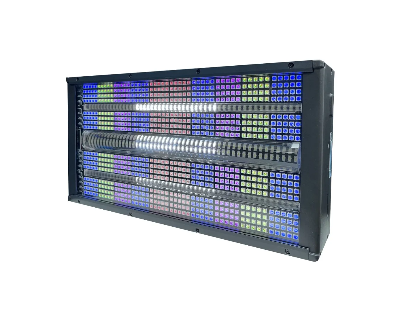 Strobetile 1000 Стробоскоп Strobetile 1000 Светодиодный стробоскоп. Источники света 200 белых светодиодов по 3Вт каждый + 800 цветных 0,5Вт (RGB). Цветосмешение White + RGB.40 сегментов RGB, 30 сегментов белых. Защита IP65. Управление по D