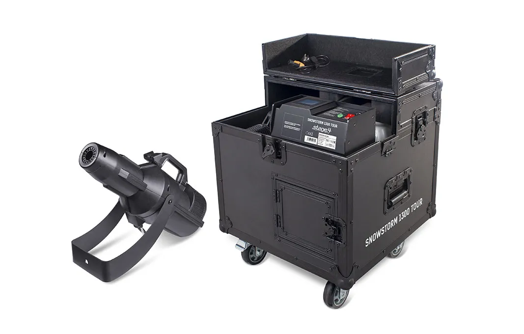 STAGE4 - SNOWSTORM 1300 TOUR (MK2). Профессиональный сценический генератор снега в туровом кейсе. Версия второго поколения. Сокращенное время очистки, возможность установки распылителя ниже основного блока. Максимальная потребляемая мощность 1250Вт. Емкос