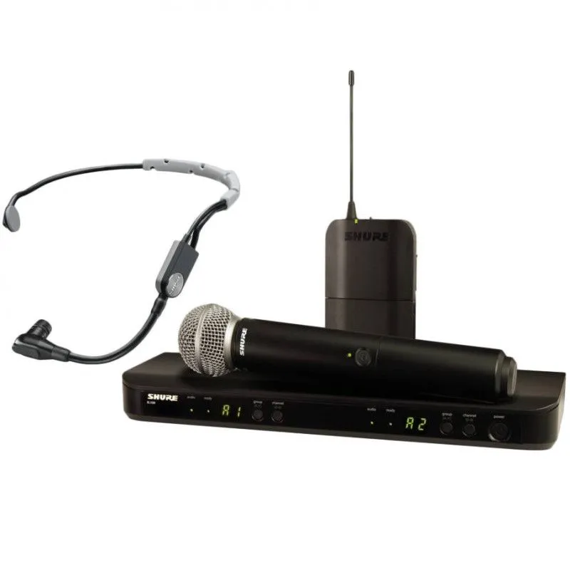 Микрофонная система SHURE [BLX1288E/SM35-M17] беспроводная, двухканальная, с головным микрофоном SM35 и ручным передатчиком SM58. Частота UHF 662-686 МГц