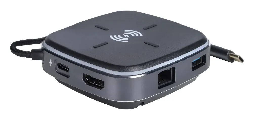 Многофункциональная док-станция Intrend [ITACS-9W] Type-C с беспроводной зарядкой 3 встроенных высокоскоростных USB 3.0, встроенный высокоскоростной TF и SD карт ридер, разъем RJ-45 для подключения к локальной сети HDMI 4K/30Hz, 60W Power Delivery порт,