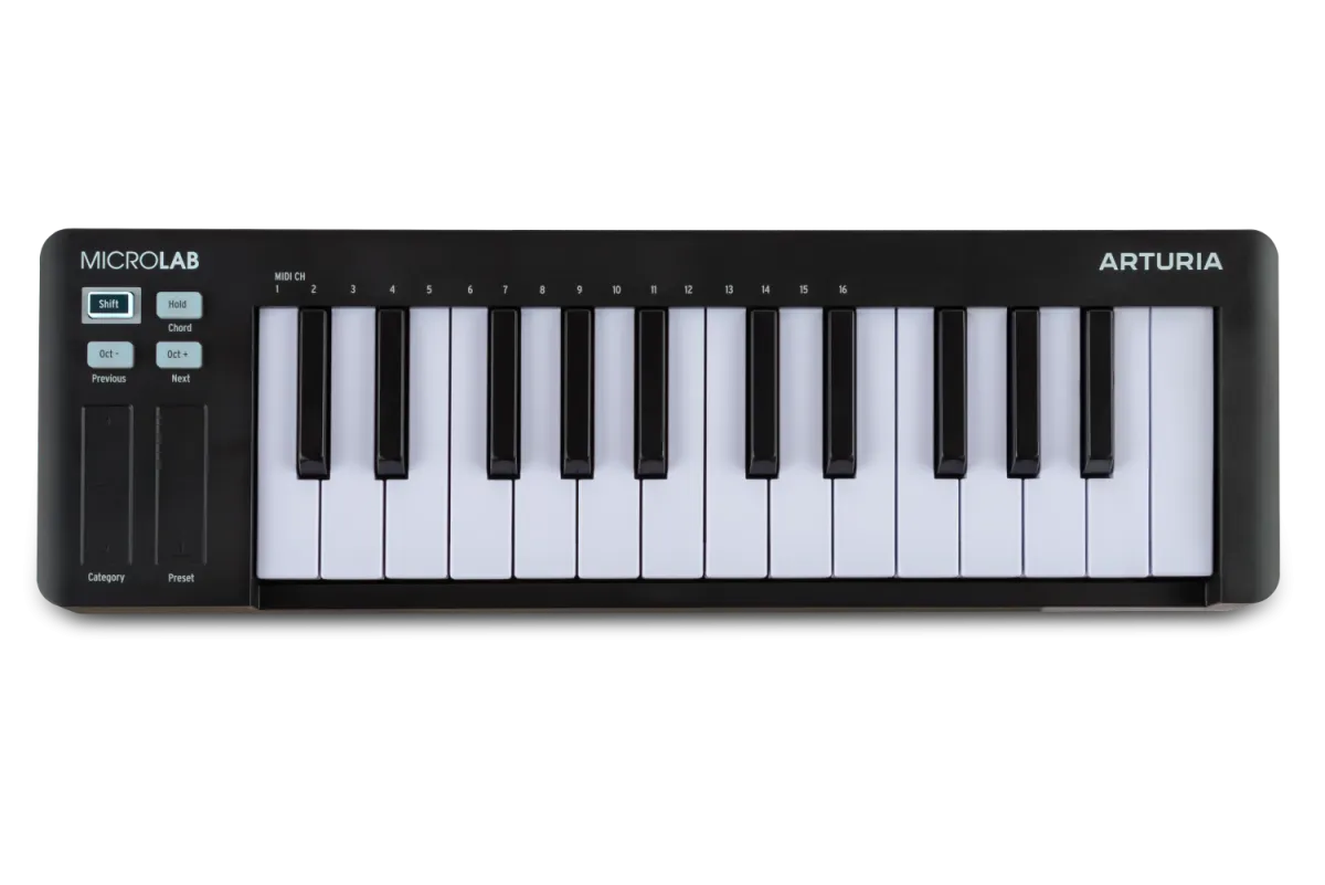 MIDI клавиатура [231512] Arturia [MicroLab 3 Black] 25 клавиш, чувствительных к скорости нажатия, сенсорные полосы pitch и modulation, режим игры аккордами, разъем для подключения педали, type-c, ПО: Analog Lab Intro, Ableton Live Lite. Цвет - черный.