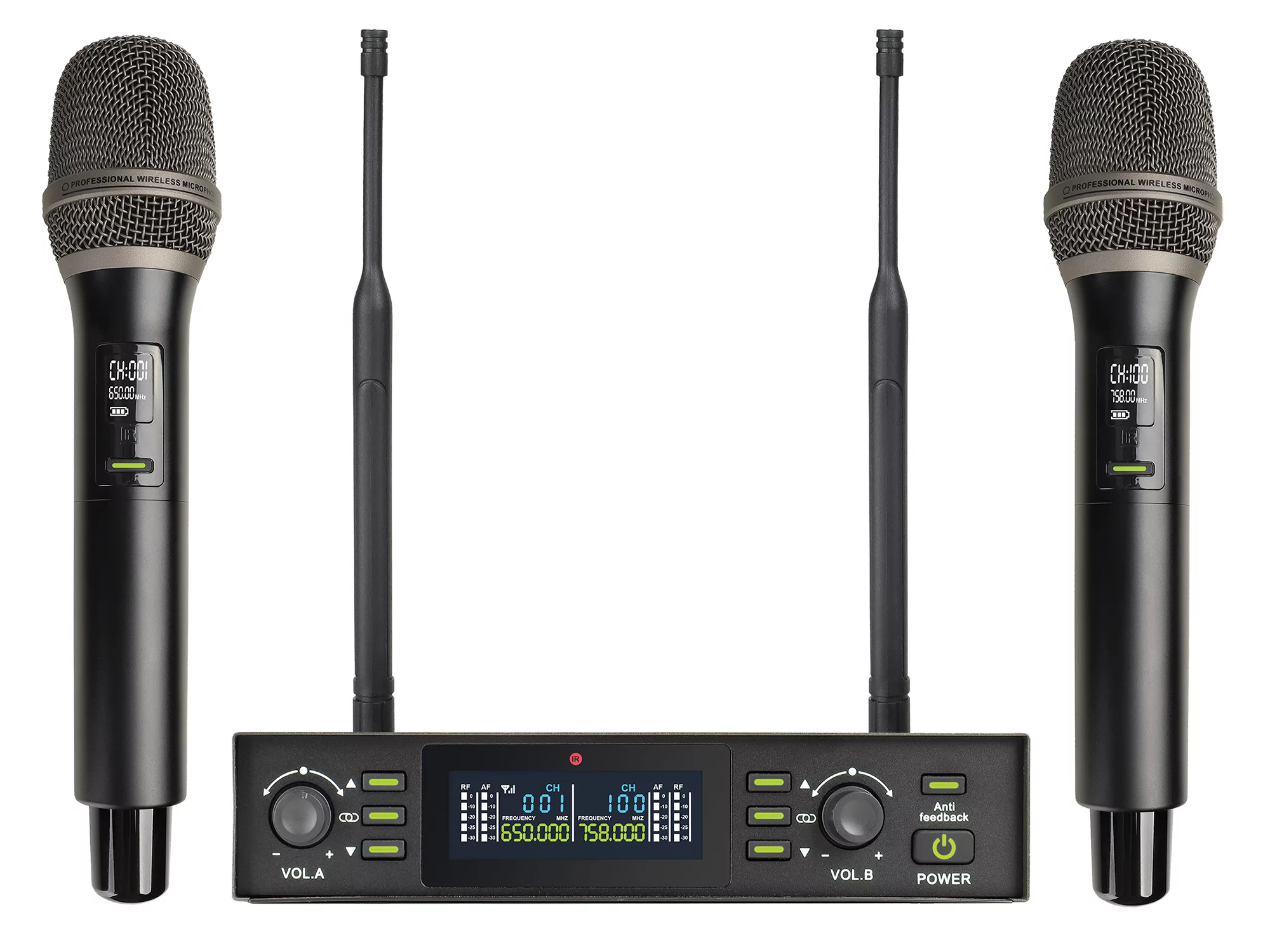 Микрофонная радиосистема [DX800FK] Axelvox [DX800FK] UHF 650 - 758 MHz, подавитель обратной связи, цифровая модуляция, LCD дисплей, DSP, ручной микрофон - 2 шт.