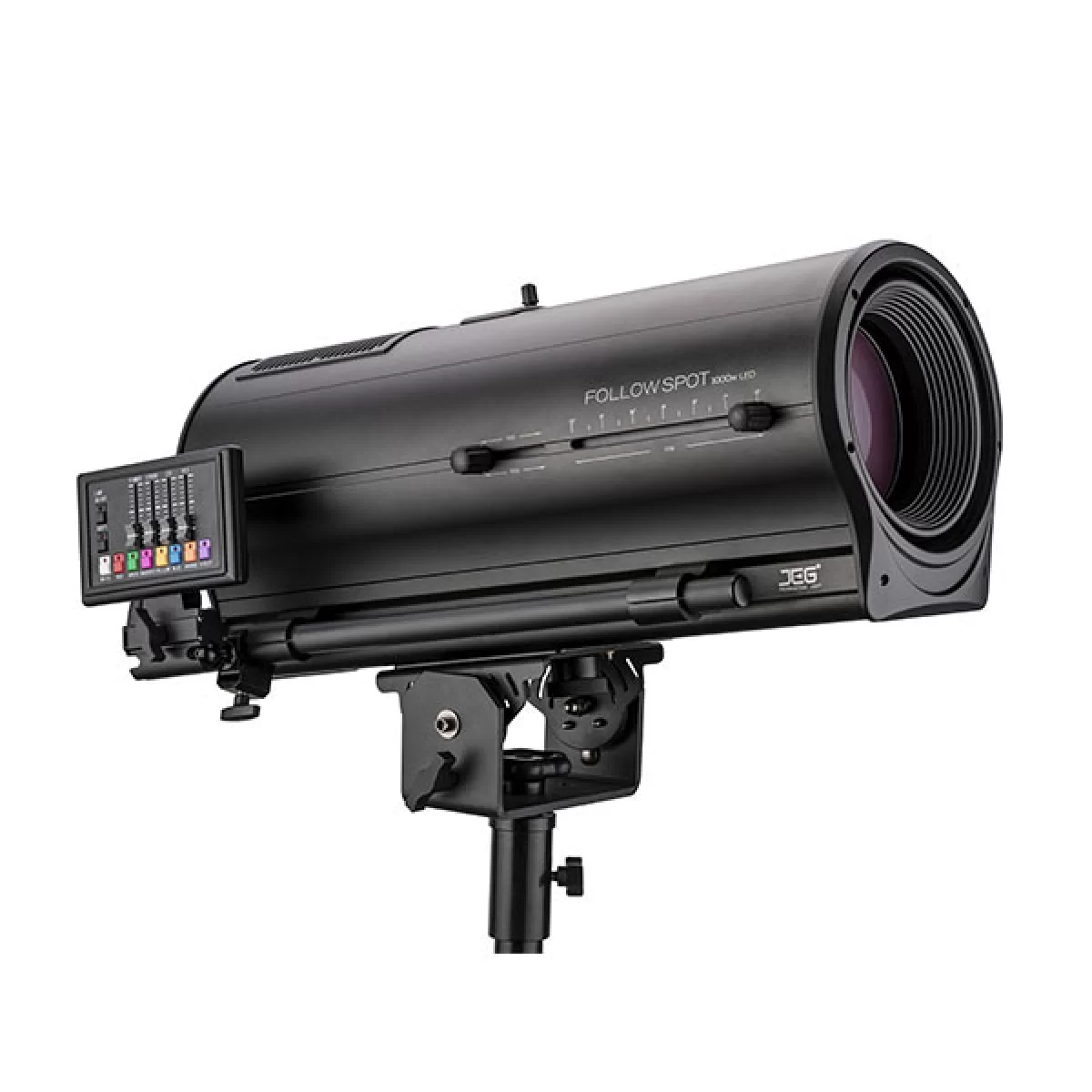 JEG 2300 LED FOLLOW SPOT 1000S Прожектор следящего света / 1 кВт / Zoom 6°-12°/ 104 960 Лк@5м / 3200К-7000К / ручной фокус и зум / ирис / фрост / 8 цветов / 4 фейдера и 10 кнопок / 6 сh / до 50м